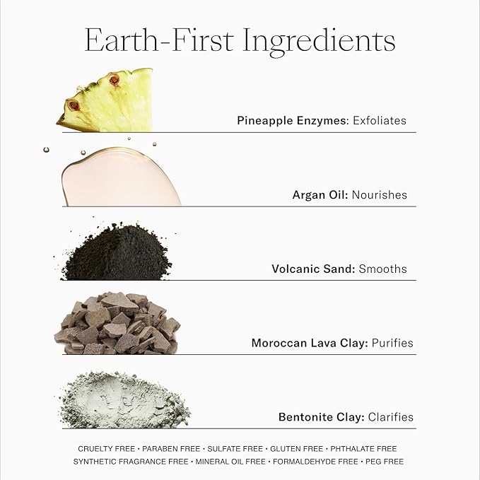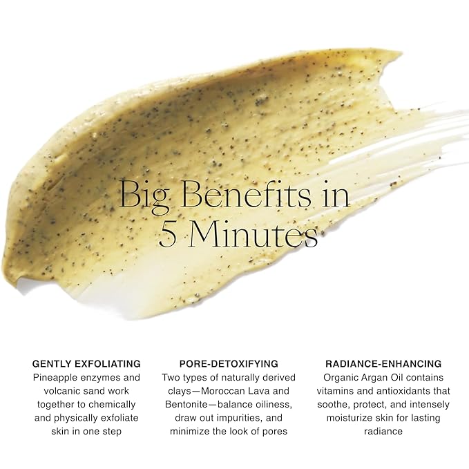 • Dual-Action Exfoliation with Two Purifying Clays - This pore minimizer mask features two types of detoxifying, naturally derived clays—Moroccan lava and bentonite clay —which work together to balance oiliness, draw out impurities, and help purify and reduce the appearance of pores.