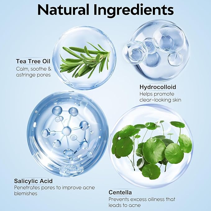 • 🌿【Zit Patches with Natural Ingredients 】Our pimple patches which includes tea tree oil(calming, soothing, and pore-tightening), salicylic acid(penetrating pores and helping to clear up skin), Centella(faster for acne healing & reduce inflammation), and hydrocolloid(promote clear-looking skin). These zit patches for face are ideal for absorbing pus from acne, speed up the acne elimination process