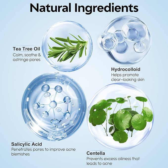 • 🌿【Zit Patches with Natural Ingredients 】Our pimple patches which includes tea tree oil(calming, soothing, and pore-tightening), salicylic acid(penetrating pores and helping to clear up skin), Centella(faster for acne healing & reduce inflammation), and hydrocolloid(promote clear-looking skin). These zit patches for face are ideal for absorbing pus from acne, speed up the acne elimination process