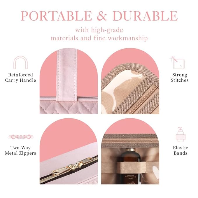 • USER-FRIENDLY DESIGNS: Designed with user convenience in mind, this travel bag for toiletries incorporates supporting pads to maintain its shape and provide excellent protection for the items inside. Elastic straps keep toiletry bottles upright, preventing liquids from escaping and causing a mess. The reinforced zippers enhance durability and ensure smooth opening, adding to the overall user-friendly experience.