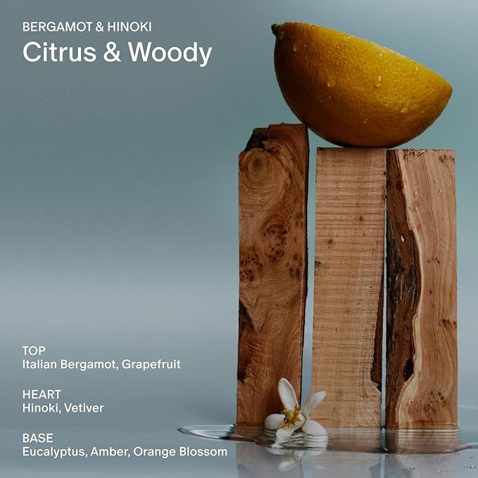 • Scent Notes — Top: Italian Bergamot, Grapefruit. Heart: Hinoki, Vetiver. Base: Eucalyptus, Amber, Orange Blossom.