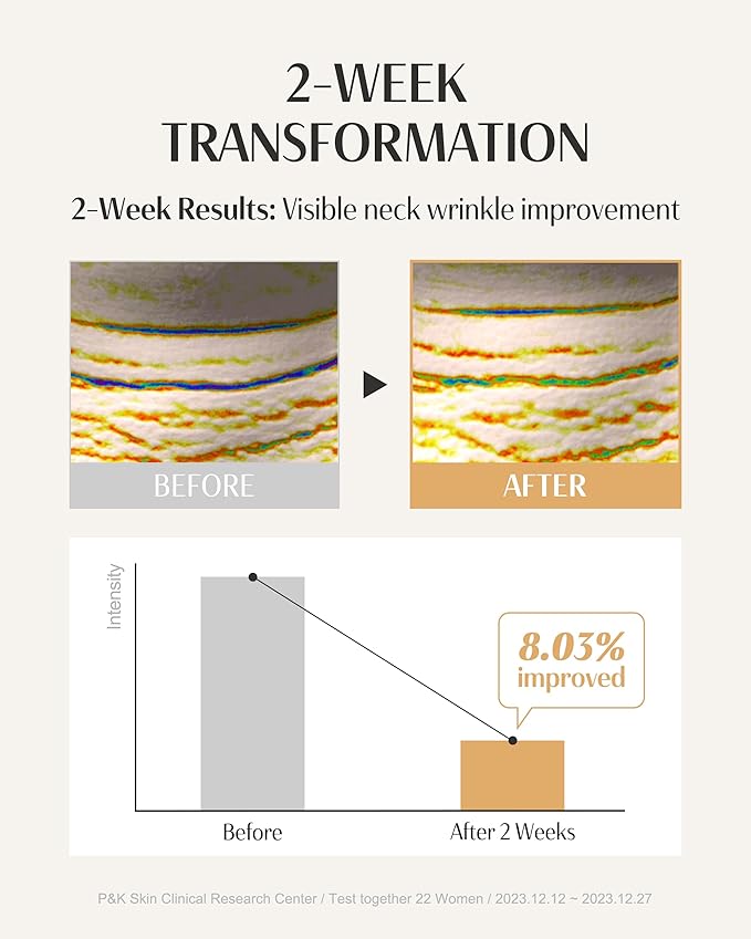 • ADVANCED PEPTIDE FORMULA. Reveal 8.03% less visible neck lines in just 2 weeks with this advanced tighten lift neck cream, infused with Collagen(300Da), 25 types of low-molecular-weight Peptides and Skin Lifting Pro Peptide. Designed to target fine to deep-set lines and sagging skin, visibly lifting the delicate and thin neck skin for a younger appearance.
