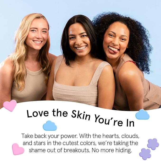 • Your Whitehead Warriors: Who says blemish patches can't be cute? Our zit patches for face come in pink hearts, purple flowers, and blue cloud shapes. They shield spots from outside nasties and serve as an important reminder to avoid skin-picking.