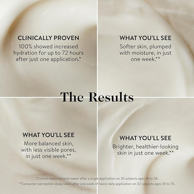 • Skin Hydration: This lightweight moisturizer delivers up to 72 hours of moisture after a single application while strengthening the skin’s moisture barrier, reducing shine, and supporting longer-term benefits like brightening, plumping and smoothing.