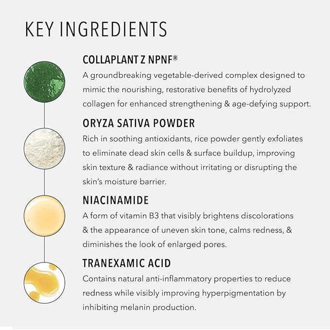 • RESULTS: A potent combination of fortifying peptides, Niacinamide,, Tranexamic Acid, rice powder, and advanced illuminating actives visibly smoothes the skin, revealing a healthy, balanced complexion that glows