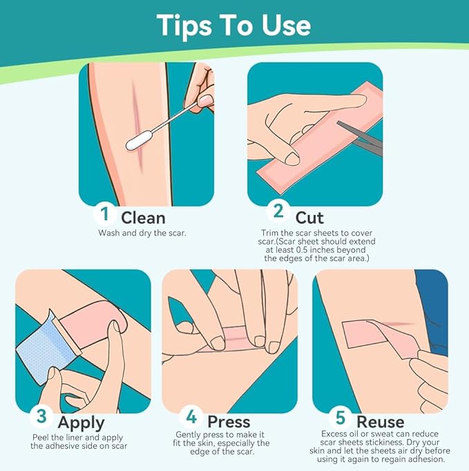 • When to Start Using: Commence the application of scar sheets as soon as the skin has fully healed and there are no signs of oozing or crusting in the area. For existing scars, you can begin using silicone scar sheets immediately,as long as the skin has completely healed. Recommend using it for at least 60-90 days. For best results, alternate scar sheets every 12 hours