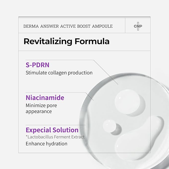 • [CNP DERMA ANSWER ACTIVE BOOST AMPULE] CNP Derma Answer Active Boost Ampule rejuvenates skin by targeting aging signs, enhancing elasticity, and diminishing the appearance of fine lines, revealing a youthful appearance in just 4 weeks.
