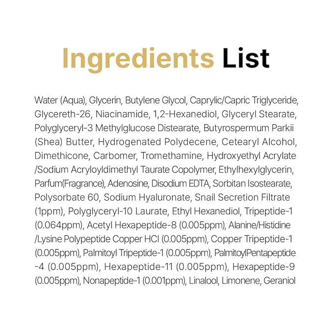 • Active Ingredients : Niacinamide, Glycerin, Adenosine, Snail Secretion Filtrate, Ceramide NP, Peptide 9