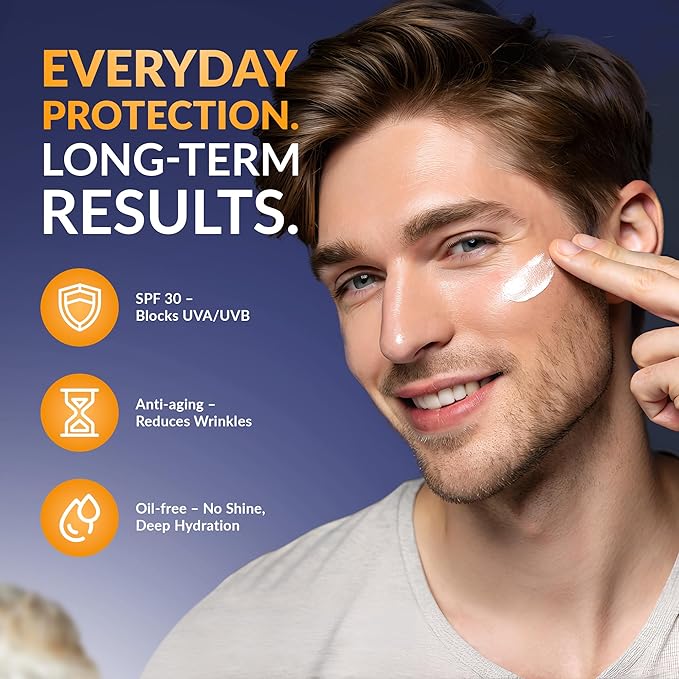 • All-in-One SPF 30 Protection and Moisture: This facial sunscreen men use daily combines sun screen SPF 30 and hydration. The lightweight texture protects your skin while delivering essential moisture. Ideal face moisturizer for men who want simple, effective daily care.