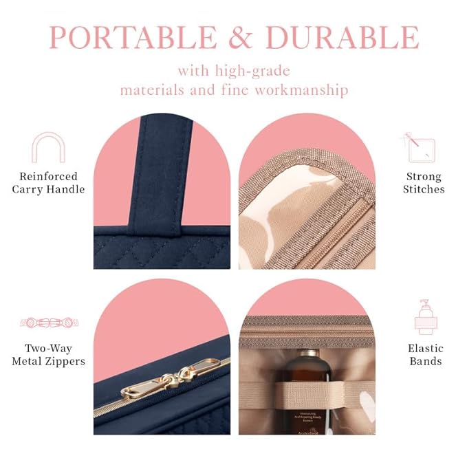 • USER-FRIENDLY DESIGNS: Designed with user convenience in mind, this travel bag for toiletries incorporates supporting pads to maintain its shape and provide excellent protection for the items inside. Elastic straps keep toiletry bottles upright, preventing liquids from escaping and causing a mess. The reinforced zippers enhance durability and ensure smooth opening, adding to the overall user-friendly experience.