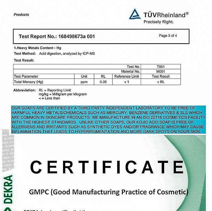 • All natural soap that is very gentle and effective. It will not cause irritation, inflammation or allergic reactions like other Kojic Acid Soaps that contain synthetic dyes and fragrance. Before purchasing a Kojic Acid soap, demand to see the ingredients. Our soap is free of synthetic chemicals such as Fragrance, has no synthetic Dyes, no SLS, no Parabens, no Phthalates which are often hidden in Fragrance, no Toxic Heavy Metals, not tested on Animals and Vegan Friendly.
