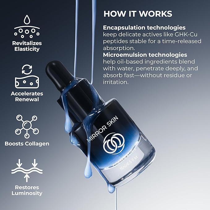 • How To Use - Use your MIRROR SKIN peptides serum for face twice daily, once in the morning and once at night. Apply enough to lightly cover your entire face, gently tapping into the skin. Feel free to pair with a sunscreen for face.