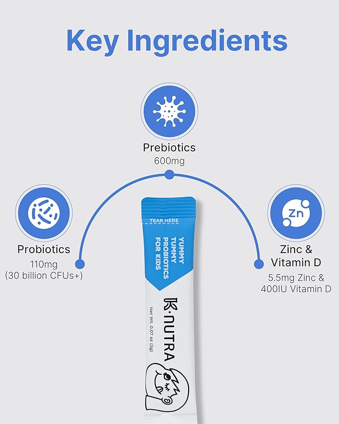 • KNUTRA YUMMY TUMMY PROBIOTICS FOR KIDS (60g, 30 Stick Packs) - This premium dietary supplement provides 30 billion CFUs from 8 diverse probiotic strains, including Lactobacillus and Bifidobacterium, designed to enhance your child’s digestion and gut health with each convenient stick pack.