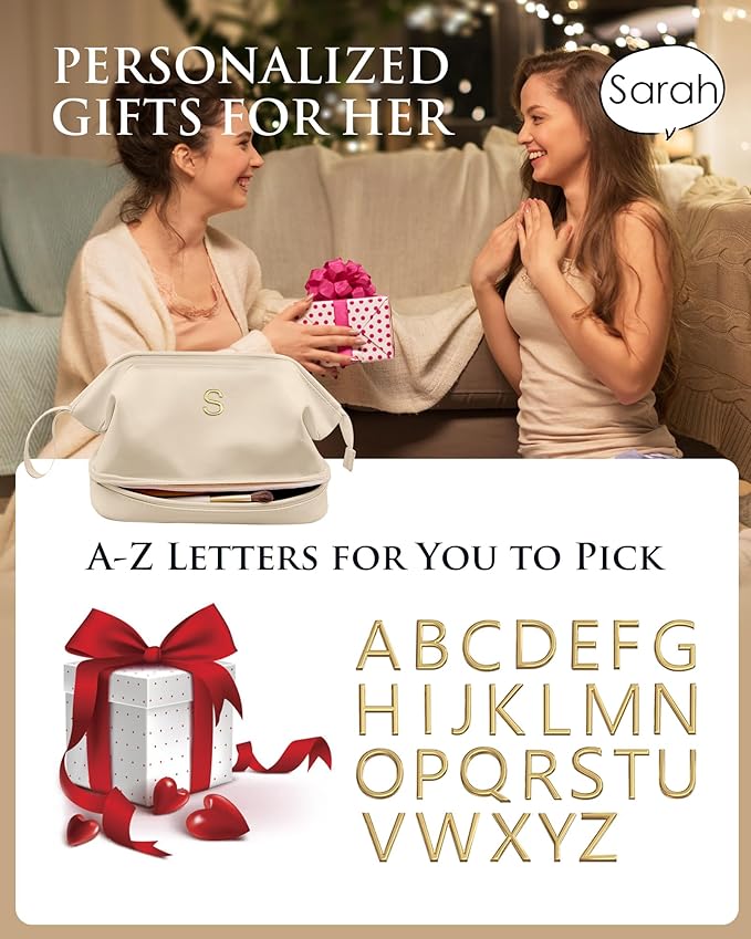 Bridesmaid Gift, Initial Makeup Bags, Personalized Double Layer Cosmetic Bag with Makeup Brush Organizer, Waterproof, Large Capacity PU Leather Travel Toiletry Bag