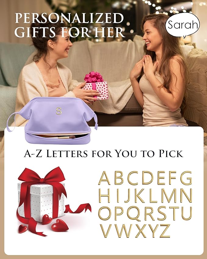 Gifts for Her: Initial Large Makeup Bags, Personalized Double Layer Cosmetic Bags with Makeup Brush Organizer, Waterproof PU Leather Travel Toiletry Bags for Wedding & Bridesmaid Gifts