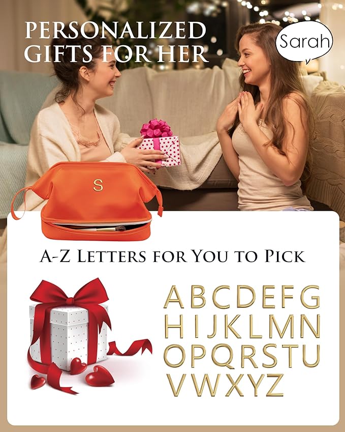 Gifts for Her - Initial Large Makeup Bags, Personalized Double Layer Cosmetic Bags with Makeup Brush Organizer, Waterproof PU Leather Travel Toiletry Bags for Wedding & Bridesmaid Gifts