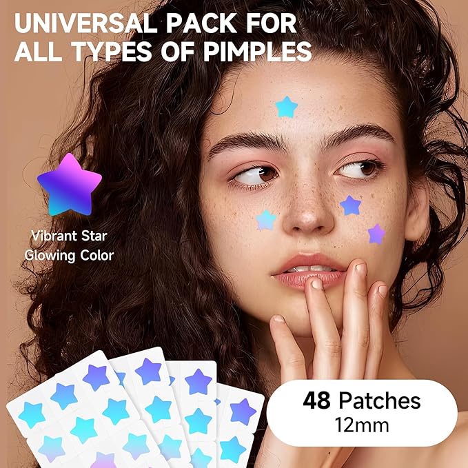 • FASHIONABLE COLORS & SHAPES | VALUED LARGE PACK: Each pack contains 48 counts star-shaped patches, providing you with an ample supply to tackle any breakout situation that arises. The iridescent colors are unique dazzling blue, shining under indoor & outdoor lights. Very fantastic and great value for your money!