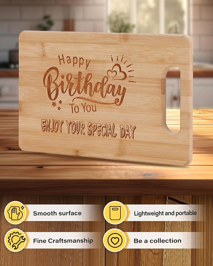 • 【Practical Cutting Board】Different with generic cutting board, our cutting board with 100% bamboo material and pure carving craftsmanship, no plastic stickers to interfere with the use of the product. This bamboo cutting board with a handle design that makes it easy to use and carry. And printed with the warming message "Happy Birthday to You", our cutting board birthday gift serves as a meaningful reminder of the joy and warmth that birthday brings.