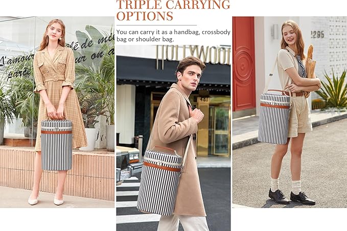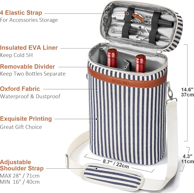 • CONSIDERATE DESIGN & MULTIFUNCTIONAL: MAYICIVO Insulated Wine Carrier Tote Bag (8.7’L x 4.3’W x 14.6’H) can hold 2 standard 750ML wine bottles or one bottle with two 12oz wine tumblers. Interior removable divider keeps 2 bottles separate and avoid colliding. 4 elastic straps on the top designed for wine accessories storage. The removable adjustable shoulder strap (16" to 28") & comfort handle make it portable to carry wine for dinner, party, bar, picnic, camping, beach, travel or road trip