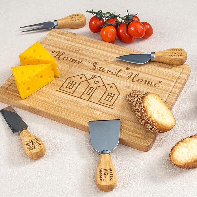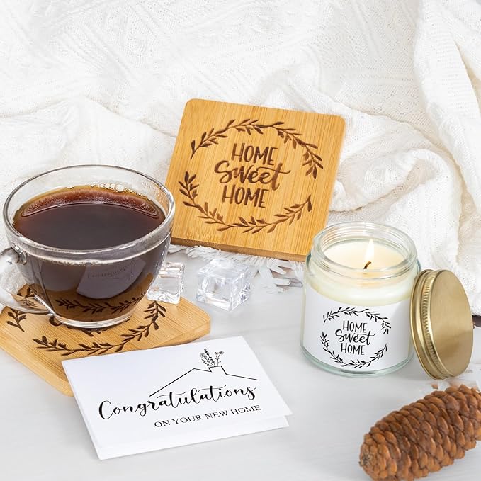 • Practical New Home Gift Ideas: The housewarming gifts new home are fun and useful, containing: 1 x home sweet home cutting board, 2 x coasters,1 x key holder, 1 x card, 2 x soap dispenser,1 x soap tray, 2 x towels, 1 x scented candle, 4 x cheese knives, 1x gift box