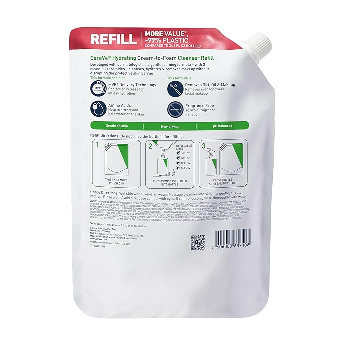 CeraVe Hydrating Cream To Foam Cleanser, Makeup Remover Face Wash For Dry Skin, Foaming Facial Cleanser With Hyaluronic Acid, Normal To Dry Skin, Fragrance Free & Non Comedogenic, 16 Ounce Refill