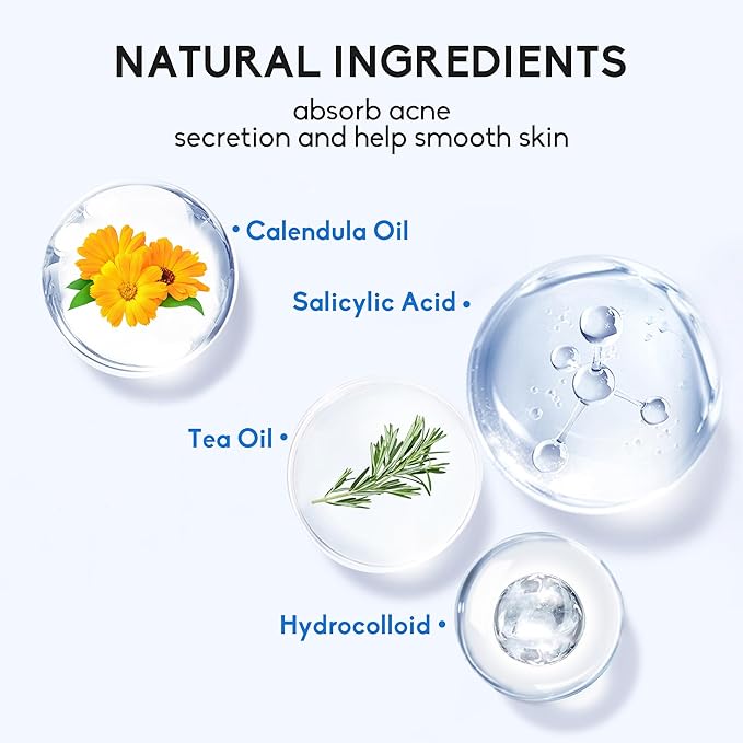 • Natural Ingredients: Our hydrocolloid bandages contain natural ingredients such as tea tree oil, salicylic acid, and calendula oil. These pimple patches for face are highly effective in absorbing gunk and shrinking spots