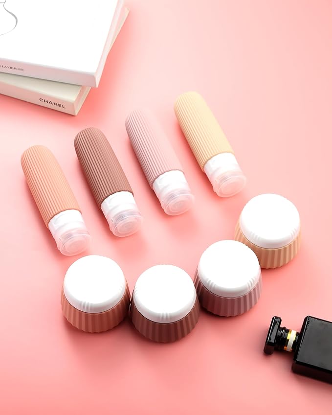 • Travel Size Toiletries: The set contains 4 pack silicone squeeze bottles and 4 pack silicone cream jars with Clear Makeup Bag.