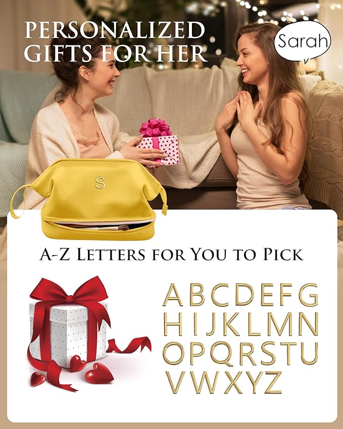 Honeymoon Gifts, Initial Makeup Bag, Travel Gifts, Personalized Bags, Waterproof Double Layer Cosmetic Bag, Large Capacity PU Leather Makeup Bags Letter Travel Toiletry Bag, Friend Gifts