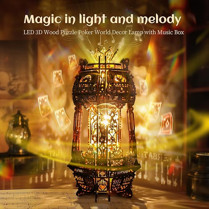 LED 3D Wood Puzzle Poker World Projector Lamp – DIY Craft Kit with LED Lights and Music Box – Creative Poker-Themed Lamp, Nightlight Gift for Home Décor (Black Walnut)