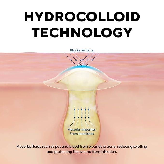 • Featuring advanced hydrocolloid polymer technology, these patches create a protective barrier that shields your skin from external elements, accelerating the healing process and keeping your skin safe.