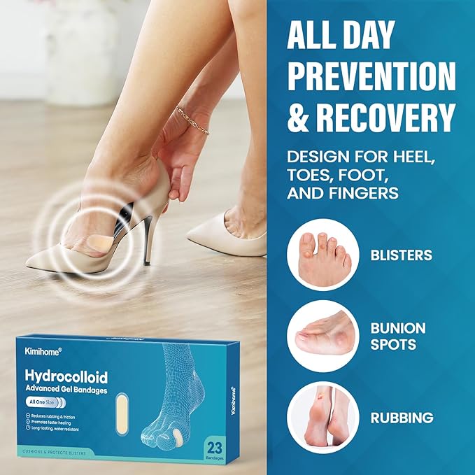 • Blister Prevention & Healing - Enhance your foot care with Kimihome blister bandages. Thank to the latest adhesive sealing hydrocolloid technology, Our blister bandages provide a 25% increase in cushioning performance to ease friction, rubbing, and foot pain caused by high intensity exercise, new shoes, high heels, hiking, walking or running.