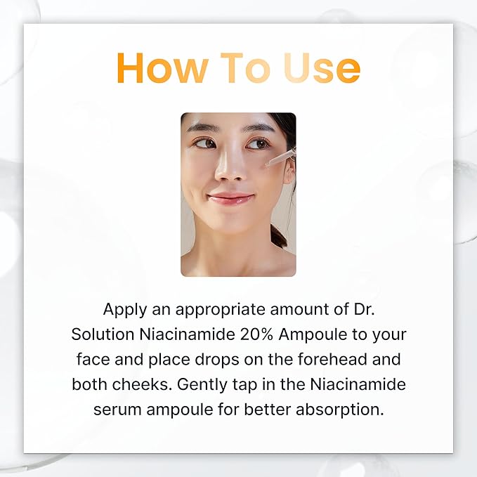 • How to Use: Apply an appropriate amount of Dr. Solution Niacinamide 20% Ampoule to your face with the pipette and drop it on the forehead and both cheeks. Gently tap in the niacinamide serum ampoule for better absorption.