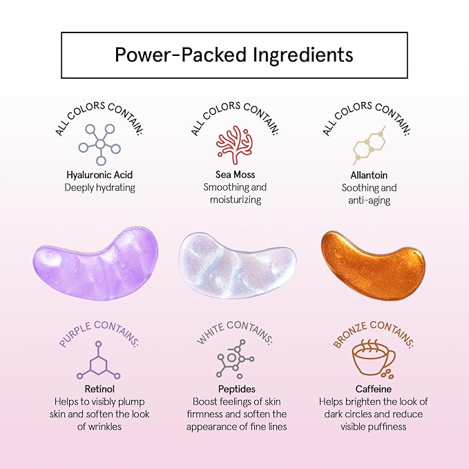 • Bye-Bye, Raccoon Eyes - Up all night? Just had a good cry? With our brightening eye wrinkle patches, it’s time to look on the bright side. Face the day with reduced puffiness and dark circles. Never get told “you look tired” again.