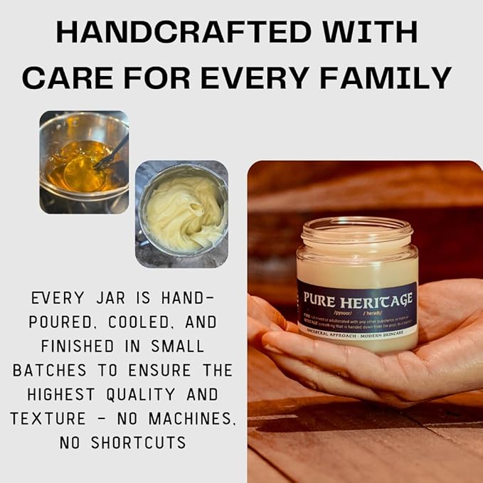 • ABOUT US: At Pure Heritage, we are a small, family-owned business committed to the highest standards for every ingredient in our products. We use only high-quality tallow, beeswax, honey, butters and essential oils.
