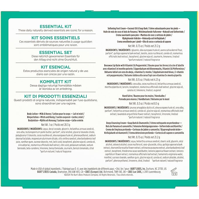 • GIFT SET: One Burt's Bees Essential Kit that includes five travel size skin care products, including Deep Cleansing Cream, Softening Foot Cream, Milk and Honey Body Lotion, Hand Salve and Beeswax Lip Balm