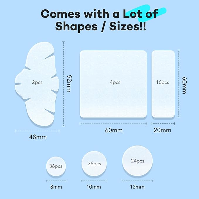 • 6 Sizes 118 Patches: LitBear zit patches come in 6 versatile sizes (8mm, 10mm, 12mm, 20x60mm, 60x60mm, 92x48mm), these combination hydrocolloid patches will help you with the smallest of blemishes to the biggest of breakouts! Choose the best one for your affected area