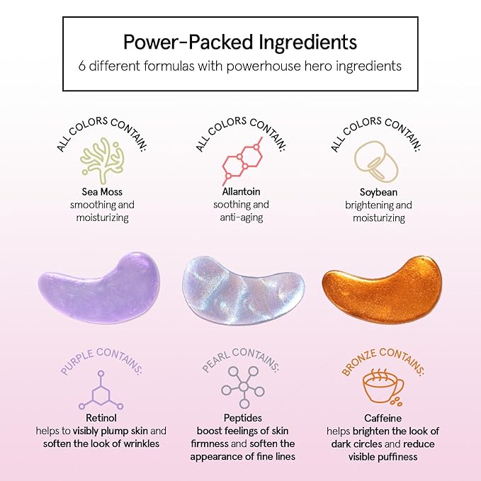 • The Ultimate Eye Mask Pack - Love our undereye mask patches? Experience all 6 colors with our 18-pair variety pack. You get 3 pairs each of our gold, pink, blue, purple, bronze, and pearl under eye masks for you and your besties to refresh & relax.