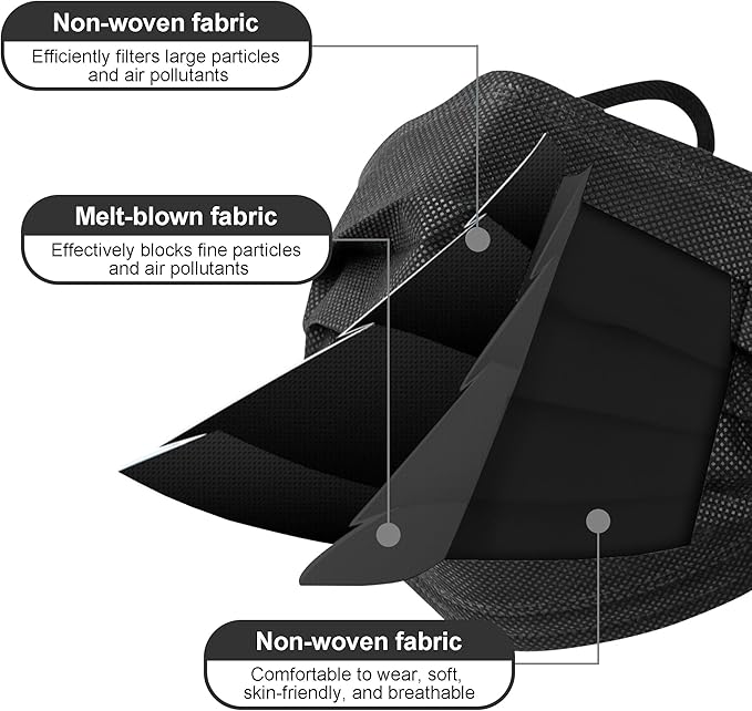 • Triple-Layer Protection with High Filtration – Constructed with non-woven fabric, melt-blown fabric, and a soft inner layer to effectively block dust, pollen, and airborne particles.