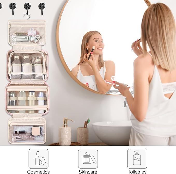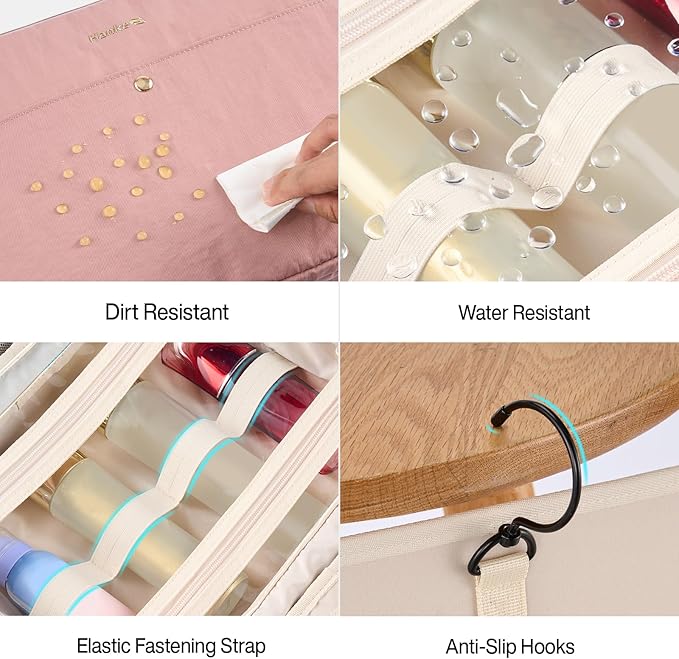 Hanke Hanging Travel Toiletry Bag for Women with Jewelry Organizer Compartment, Travel Essentials Toiletries and Makeup Bag, Water-Resistant & Stain-Resistant with Trolley Strap (Pink)