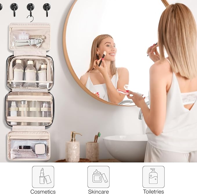 • 【Thoughtful Design】360° rotatable non-slip hooks, Hanging toiletry bag built-in elastic fixing straps, and mesh pockets. Keeps your travel toiletries or cosmetics upright while traveling. Double zipper compartment, even if not completely open, you can quickly and easily access the items; open pocket on the back, open the zipper, easily transformed into a trolley strap, free hands.