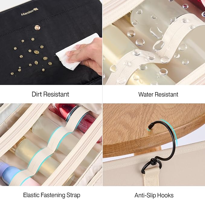 • 【Hanke Premium Travel Toiletry Bag】Product dimensions:12.6 x 5.5 x 8.7inch. Upgraded 9.8L large-capacity design holds more than standard toiletry bags. Contains 4 separate compartments that can be used to prevent toiletries and cosmetics, 1 separate jewelry compartment, and 2 open pockets in the front and back.