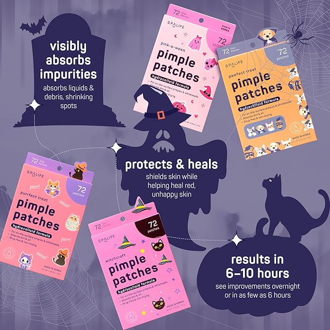 • LIMITED EDITION HALLOWEEN DESIGNS FOR PIMPLE-FREE SKIN — This 4-pack bundle brings spooky fun to your skincare routine with Pink-O-Ween, Purrrfect-Treat, WitchCraft Cats & Hats, and Halloween Pawwfect Treat designs. Perfect for fighting halloween pimple patches for face in style during spooky season!