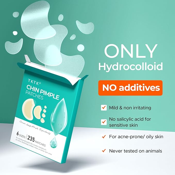 TKTK Chin Pimple Patches (235 Count 6 Sizes), XL Contoured Hydrocolloid Chin Patch 62x42 mm, Large Acne Patch for Face Blemishes Zit Breakouts, Maximum Absorption Overnight Stickers