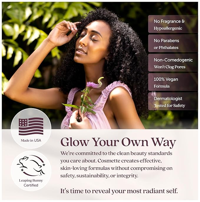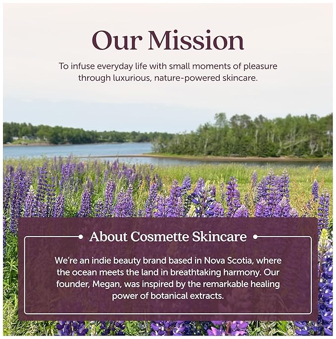 • Cosmette Skincare is committed to clean beauty standards. Our company was founded in Nova Scotia by an everyday woman looking for natural solutions for her sensitive skin. Cosmette products are cruelty free, vegan, paraben free, and non comedogenic. Dermatologically tested for safety and suitable for all skin types, we're an easy clean beauty choice for anyone looking for sustainable and mindful skincare.