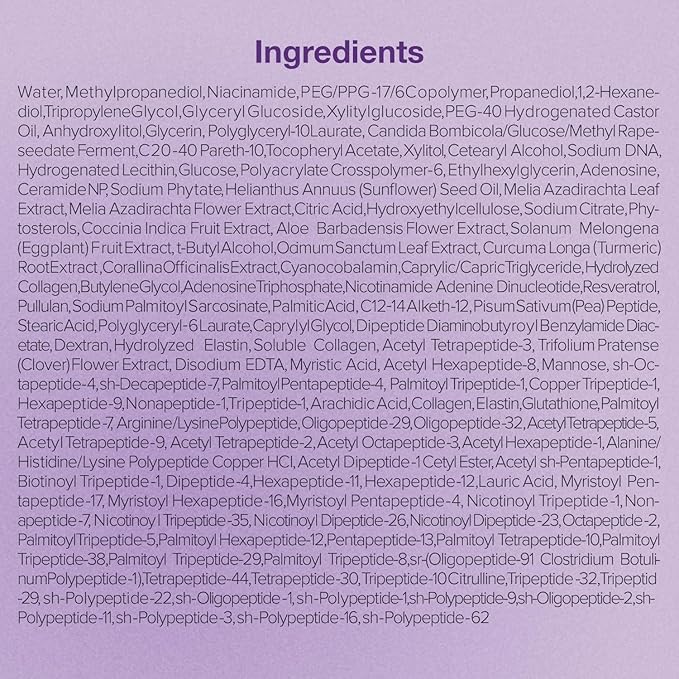 • [KEY INGREDIENTS] Formulated with 1,000ppm of 100% pure salmon PDRN to restore a natural glow and even skin tone by strengthening the skin barrier and supporting overall skin health. Powered by NAD+, an anti-aging ingredient that boosts cell turnover, stimulates collagen production, and supports repair, along with 50 peptides to visibly firm and plump the skin. *The formula’s soft violet hue comes from Vitamin B12, while its natural pearlescence is derived from ceramides.