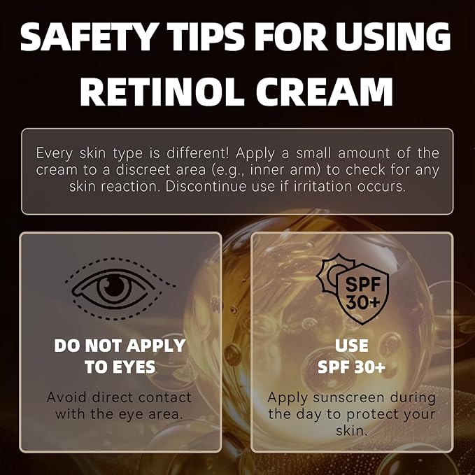 • How to Use – Apply a small amount to clean, dry skin, massaging until absorbed. Start 1–2 times a week for sensitive skin, then increase as needed. Use daily for optimal results. Always apply SPF 30+ during the day, as retinol may heighten sun sensitivity. Perform a patch test before initial use. Consult a dermatologist before use. Individual sensitivity to components is possible.
