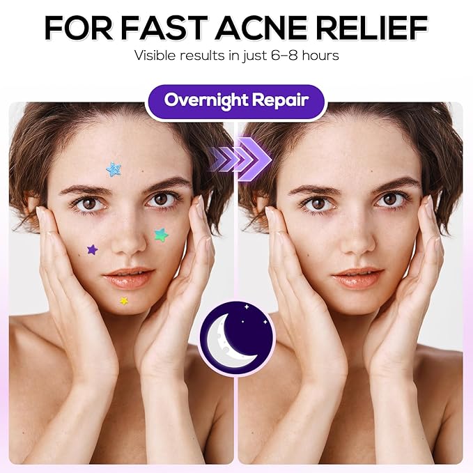 • Playful Star Designs: Ditch boring patches! Choose from 9 vibrant colors (Purple, black, yellow, green, luminous, gradient, glitter blue, glitter powder, translucent) in fun pimple patches stars. Conceal blemishes while flaunting your unique style, day or night.