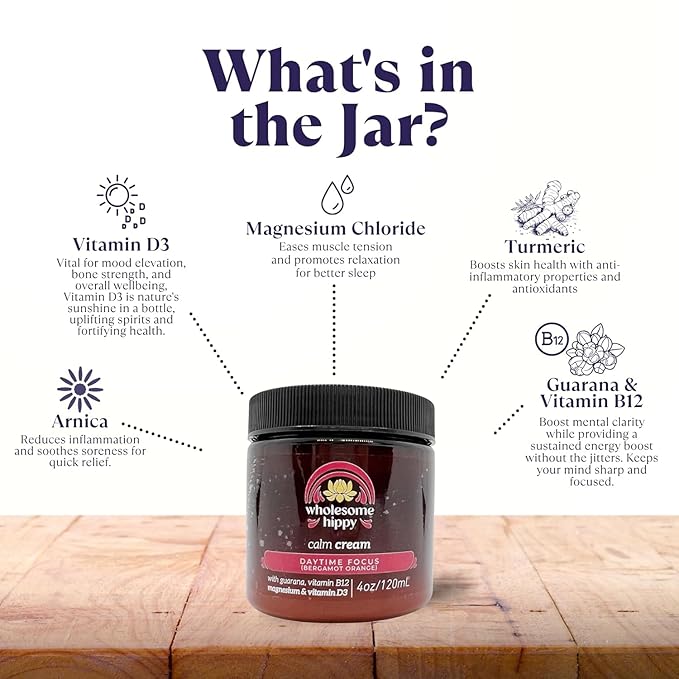 • Wholesome Hippy Daytime Focus Calm Cream – Energizing Body Butter with Magnesium, Vitamin B12, Guarana & Bergamot Orange – Moisturizing Wellness Cream for Daily Clarity – 4oz