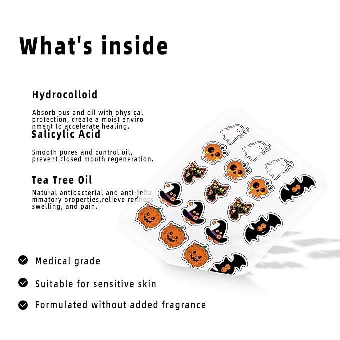 • Perfect for Halloween & Beyond:Whether you’re heading to a Halloween party or just want to spice up your daily look, these spooky-cute patches blend seamlessly with costumes and everyday wear. They’re more than just skincare—they’re a festive accessory that conceals breakouts while keeping the Halloween spirit alive