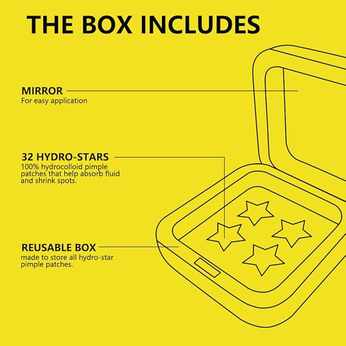 • STYLISH AND CUTE DESIGN: The Pimple patch has a transparent star-shaped design. It utilizes hydrocolloids to absorb fluids, causing redness to subside and shrinking spots. Plus, it's really cute to put on. It comes in a handy big yellow box with a mirror inside.